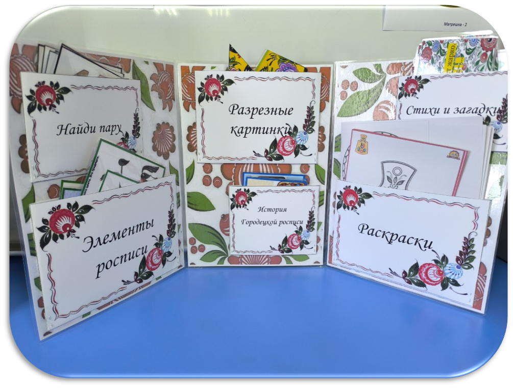 Лэпбук «Городецкая роспись» — это тематическая книжка-раскладушка, в которой помещены материалы на тему декоративно-прикладного искусства, в частности городецкой росписи.