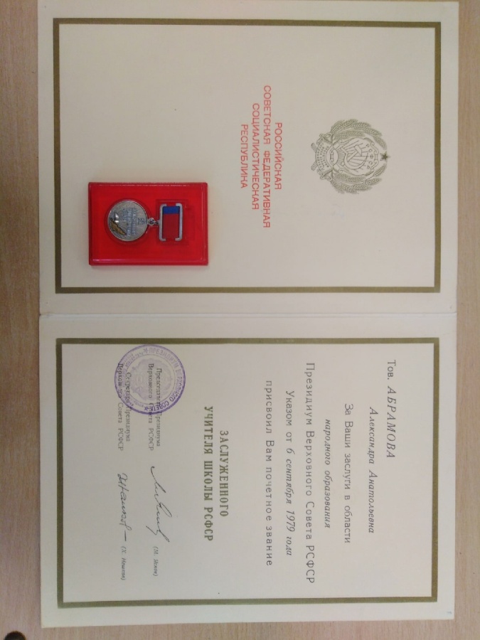 Имеет многочисленные грамоты, поощрения, записи-благодарности в трудовую книжку. В педагогической деятельности Александра Анатольевна проявила принципиальность, отзывчивость, доброту, порядочность и увлеченность своей деятельностью.. «Я всегда старалась сделать свои уроки интересными, занимательными, большое значение уделяла воспитательному значению учебного материала, Очень грустно, что в последние годы из школы уходят учителя, имеющие большой педагогический стаж и опыт, которые знают, чему надо учить; знают, как научить; понимают, что эти знания нужны людям. Хочется, чтобы наше нелёгкое дело продолжали молодые педагоги,»- сказала в интервью Александра Анатольевна. Более 32 лет составляет трудовой стаж Абрамовой Александры Анатольевны. Абрамова Александра Анатольевна вырастила и воспитала сына и дочь, которые закончили по 10 классов и получили высшее образование.