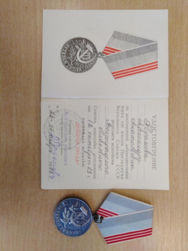 Абрамова Александра Анатольевна за долголетний добросовестный труд от имени Президиума Верховного Совета СССР решением исполкома Волгоградской области Совета народных депутатов от 12 октября 1983 года награждена медалью «Ветеран труда».