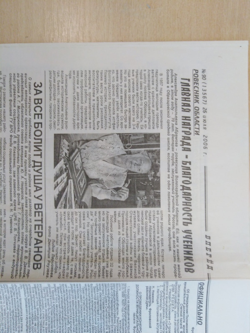 Большая газетная статья в главной районной газете «Вперёд» под заголовком «Главная награда – благодарность учеников»