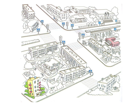 Дети делятся на пары, по два человека. Каждой паре раздаётся 2 маркера с разными цветами и схема с городом. Педагог раздаёт парам индивидуальные задания.