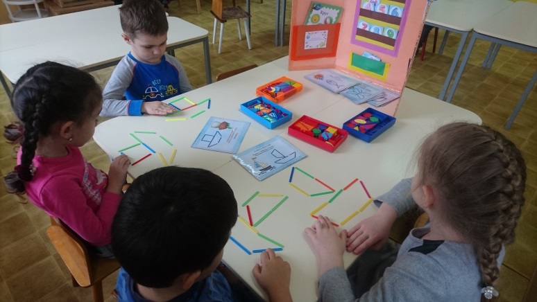 Игра “Фигуры из счетных палочек”. Игра нацелена на развитие логического мышления и мелкой моторики рук. С помощью данной игры ребёнок научится составлять геометрические фигуры из палочек приемом пристроения.