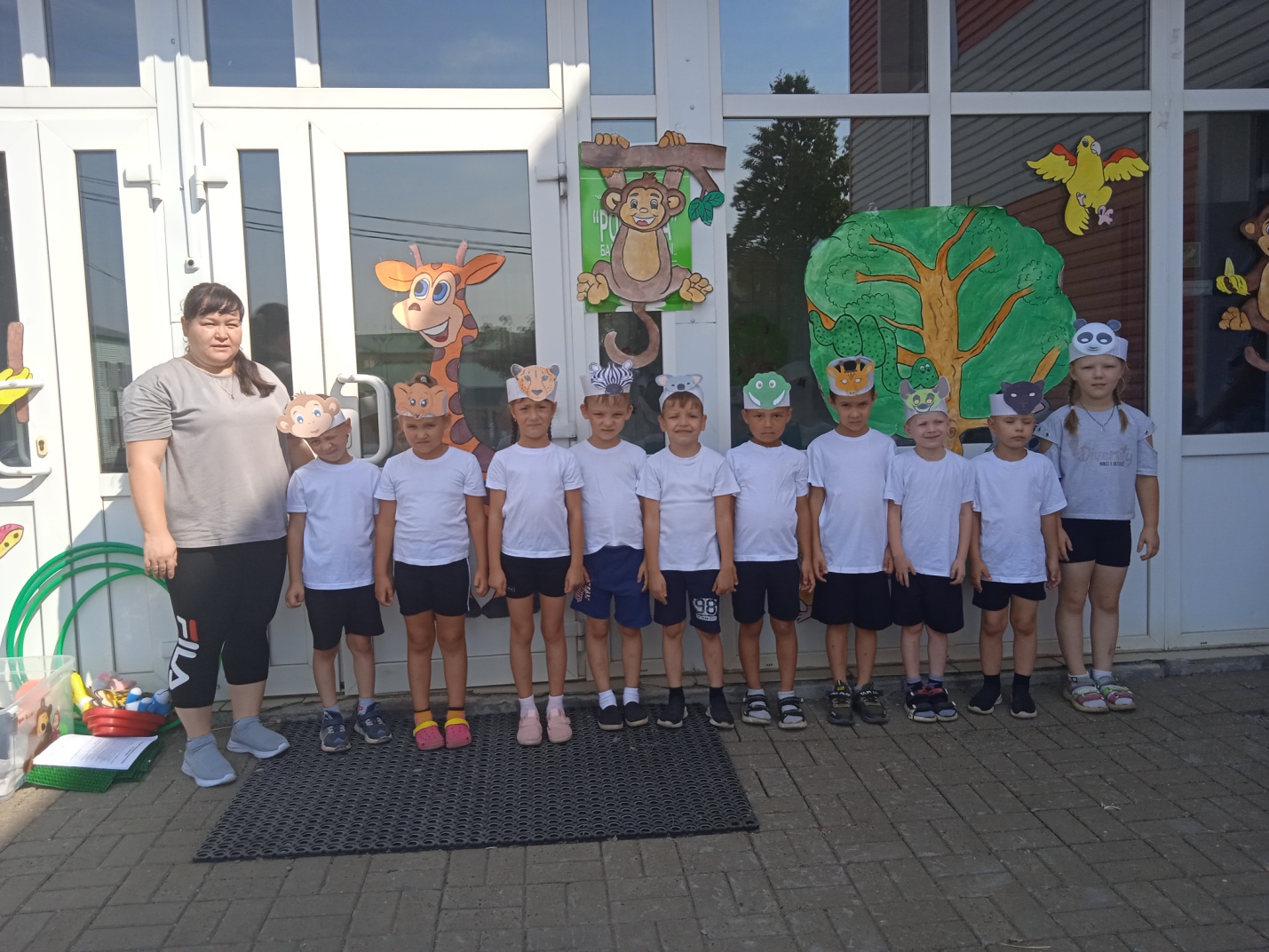 Нетрадиционное оборудование: каталки с привязанными обезьянками, муляжи бананов с липучками, резинка, соединённая в круг.