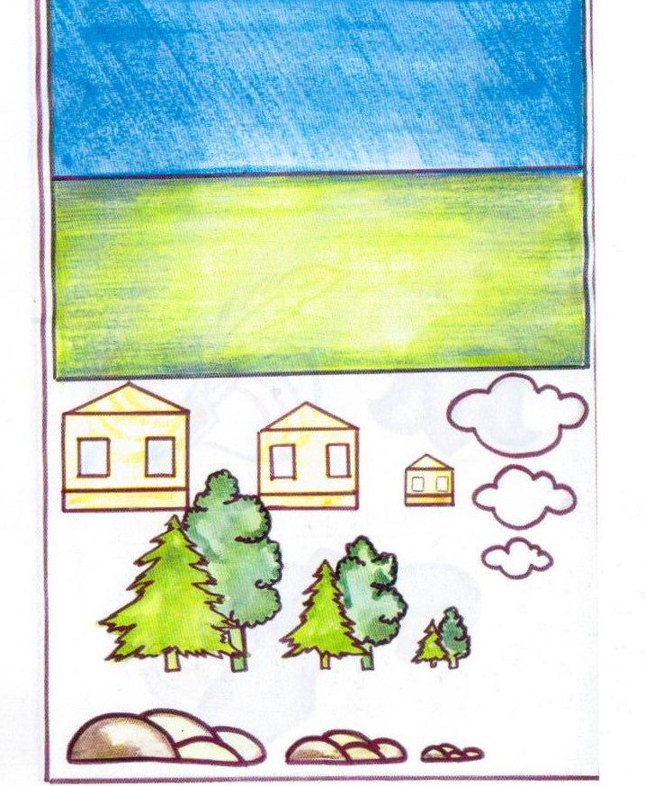 Материал: картинная плоскость с изображением неба и земли и чёткой линии горизонта; силуэты деревьев, домов, облаков, гор различной величины (маленькие, средние, большие).