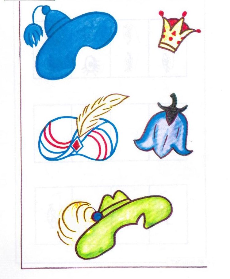 Материал: таблица с изображением головных уборов сказочных персонажей, цветные карандаши, фломастеры, акварель, гуашь, кисти.