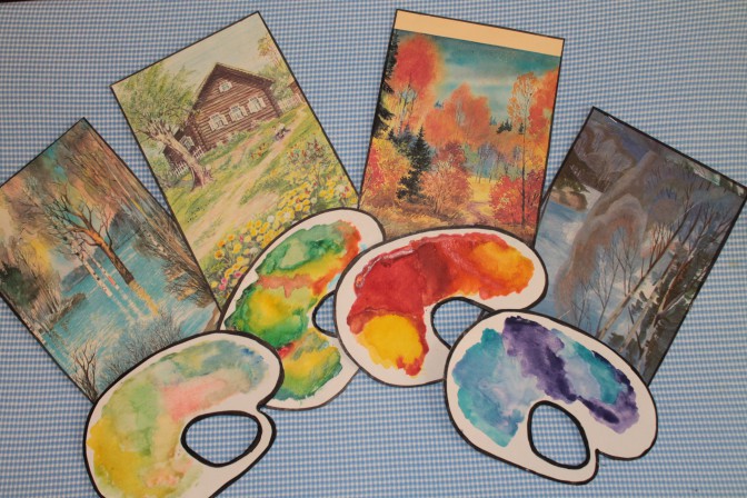 Описание игры: на столе лежат четыре репродукции картин с разным временем года. Задача обучающегося подобрать цветовую гамму, соответствующую тому или иному времени года, ответ обосновать.