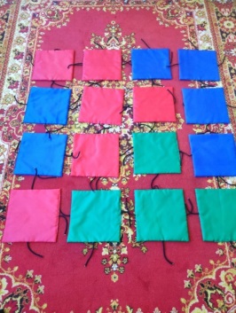 Универсальные «Коврики – кармашки» сшиты из плащевой ткани 3-х цветов (синий, красный, зеленый), в форме квадрата (20Х20 см) с веревками-завязками, на одной стороне коврика пришит прозрачный карман для картинок, карточек и др.