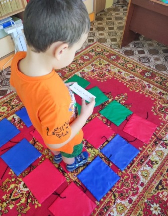 Организация: коврики располагаются на полу в клеточном порядке, с расстоянием между квадратами – 15 см. Ребенку дают карточку с цифрами и стрелками (цифра-количество шагов, стрелка – направление шагов), под одним из ковриков спрятана звезда (сюрприз), ребенок двигается по маршруту и озвучивает шаги, употребляя слова «1 шаг направо», «2 шага налево», «2 шага вперед», «1 шаг назад» и т.д. В конце маршрута ребенок проверяет, есть ли под ковриком звезда (сюрприз), тем самым определяет правильность выполнения задания.