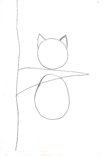 Затем рисуем на веточке круг (голова), треугольники (уши), под веточкой овал (туловище).