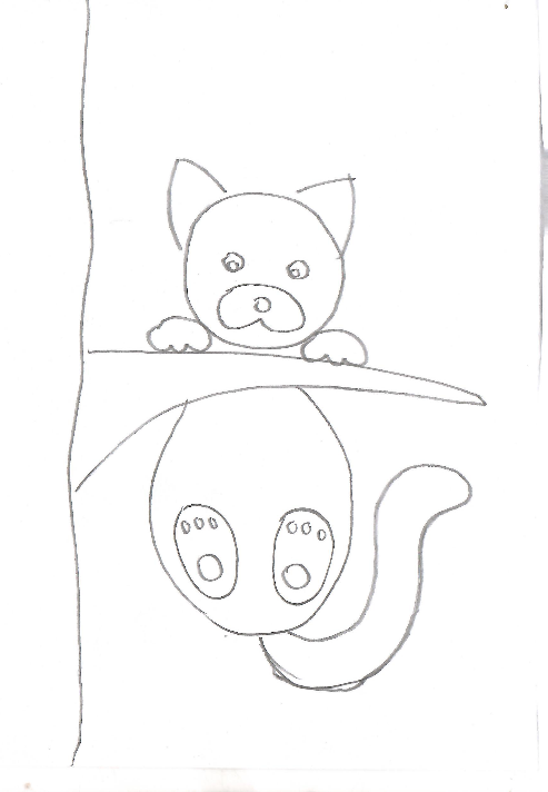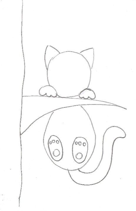 2) На этом этапе ластиком подтираем не нужные линии и рисуем маленькие лапы на веточке и лапы на туловище в виде овалов добавляя детали в виде подушечек, изгибая линию рисуем хвост.