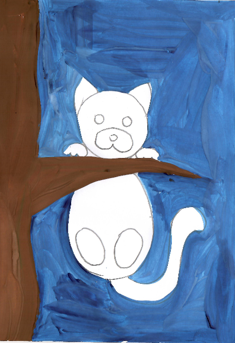 3) Далее приступаем рисованию цветом. Берём синюю или голубую краску и раскрашиваем небо. Коричневой краской закрашиваем дерево, если нет коричневого цвета, то его можно получить при смешивании в палитре красного и зелёного цвета.