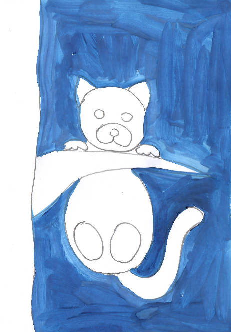 Настало время прорисовать тонкой кисточкой детали, для этого белой краской рисуем мордочку и глаза, далее берём коричневую краску и прорисовать лапки, нарисовать полоски на туловище и голове кота.