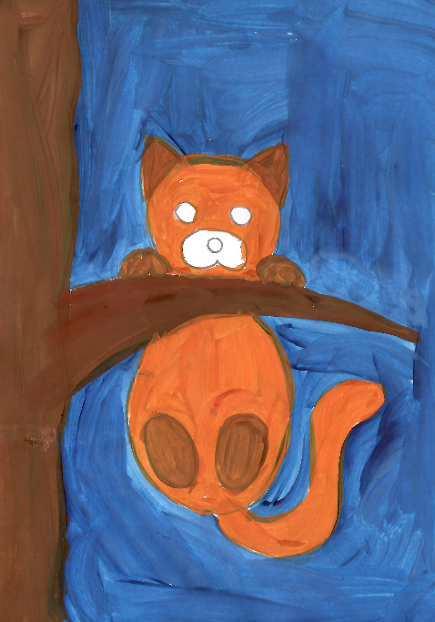 4) После, закрашиваем кота оранжевой краской. Для этого нам нужно в палитре красный и жёлтый цвета. Лапки закрашиваем оттенком темнее, для этого в оранжевый цвет добавляем немного коричневого цвета.