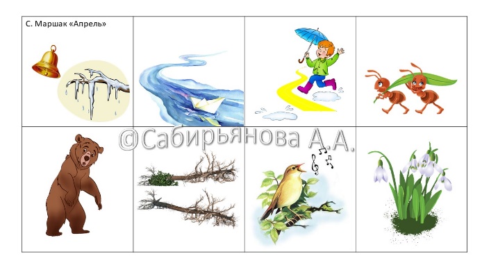 Апрель, №4 | Заучивание стихотворения Самуил Маршак «Апрель» | Формировать умение выразительно читать наизусть стихотворение, используя мнемотаблицы. |