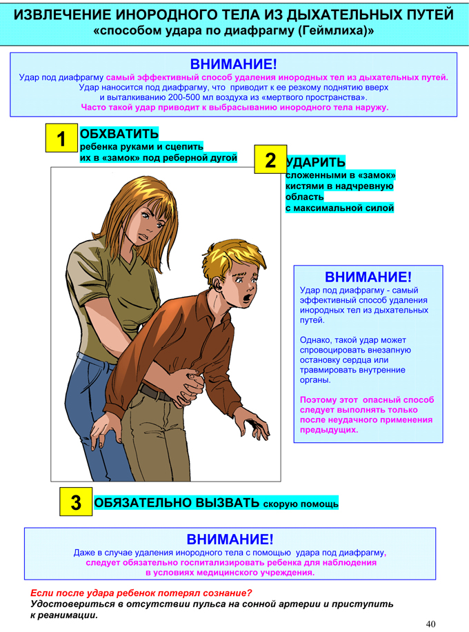 находясь сзади сидящего или стоящего ребенка, обхватить его руками вокруг талии, надавить на и произвести резкий толчок вверх до 5 раз с интервалом в 3 сек. Если больной без сознания и лежит на боку, врач устанавливает на его эпигастральную область ладонь своей левой руки и кулаком правой руки наносит короткие повторные удары (5 – 8 раз) под углом 45° в сторону диафрагмы.