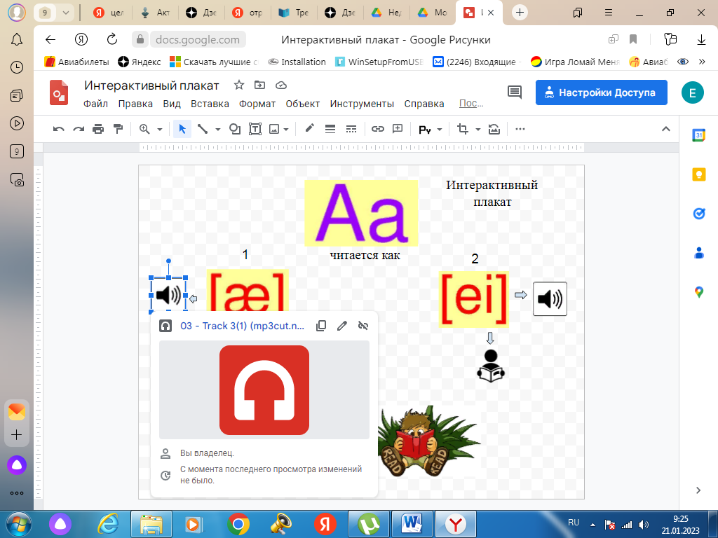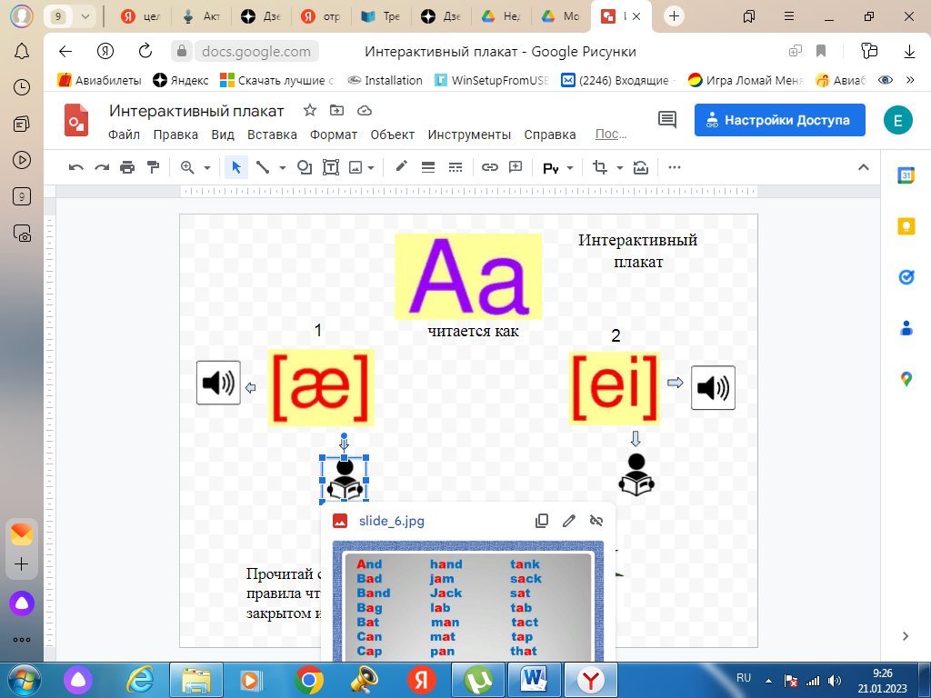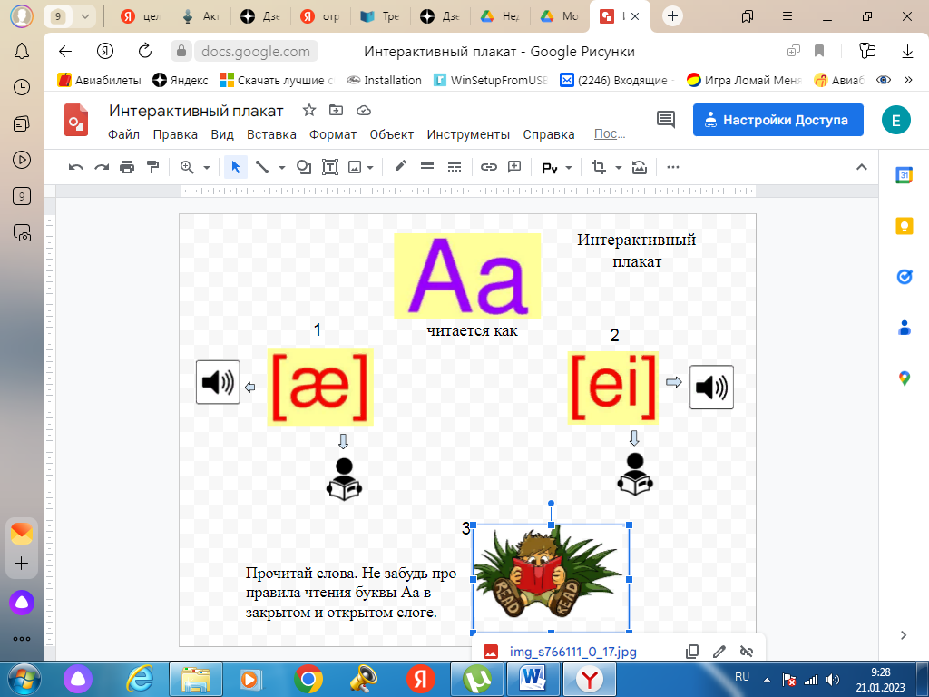 Описание: интерактивный плакат содержит аудиофайлы правильного произношения английских звуков [ei] и [æ], упражнения для отработки данного правила чтения. Для отработки или повторения правил чтения я отправляю учащимся ссылку на интерактивный плакат. Это очень удобно, так как плакат открывается и на телефоне, и на компьютере.