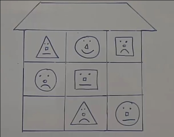 - Давайте проверим, какая геометрическая фигура спряталась в домике? Какая форма носа? Форма рта?
