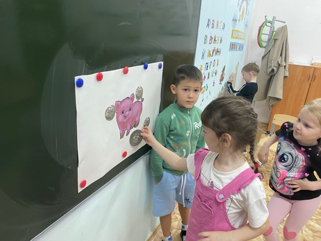 Детям предлагается коллективно «накопить» монетки в большую копилку.