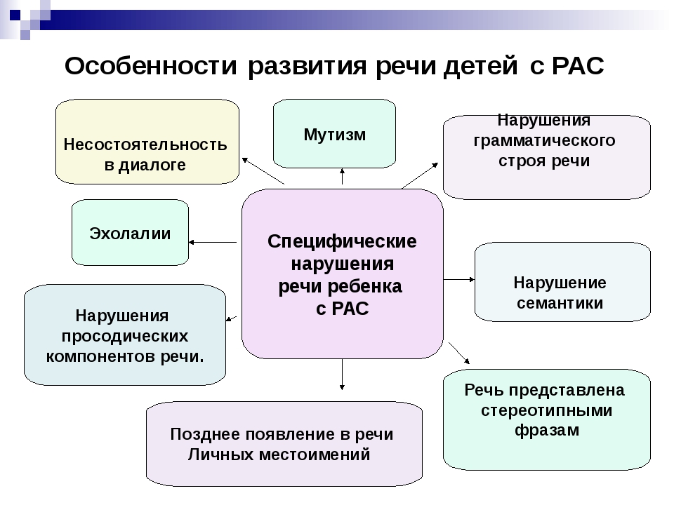 Дети с аутизмом представляют собой неоднородную группу: речевые расстройства значительно варьируются по степени тяжести и по своим проявлениям. Речевой дефект может быть изолированным или входить в состав ряда других нарушений речи.
