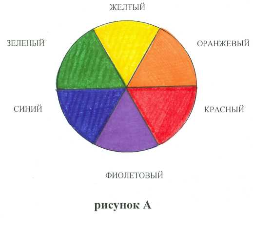 Все цвета, существующие в природе, можно разделить на две группы: хроматические,т.е. цветные, имеющие цветовой оттенок, и ахроматические - бесцветные. Самый простой цветовой круг состоит из шести цветов: три основных и три составных (рисунок А).