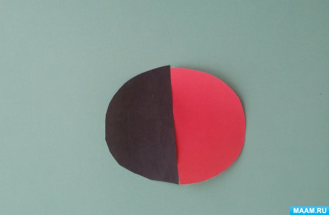 Для грудки берём и разрезаем круг пополам, одна часть будет красного цвета, а другая - чёрного: