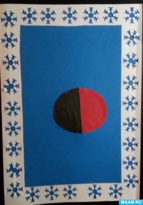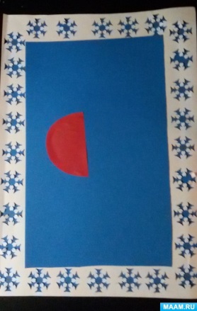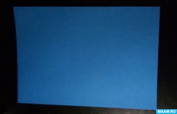Вырезаем из цветной бумаги синего цвета основной фон нашей аппликации и приклеиваем: