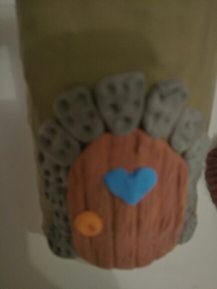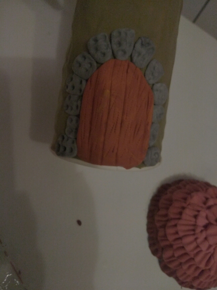 Из серого пластилина слепите камушки и приклейте их вокруг двери. Стеком продавите пластилин придавая фактуру камня.