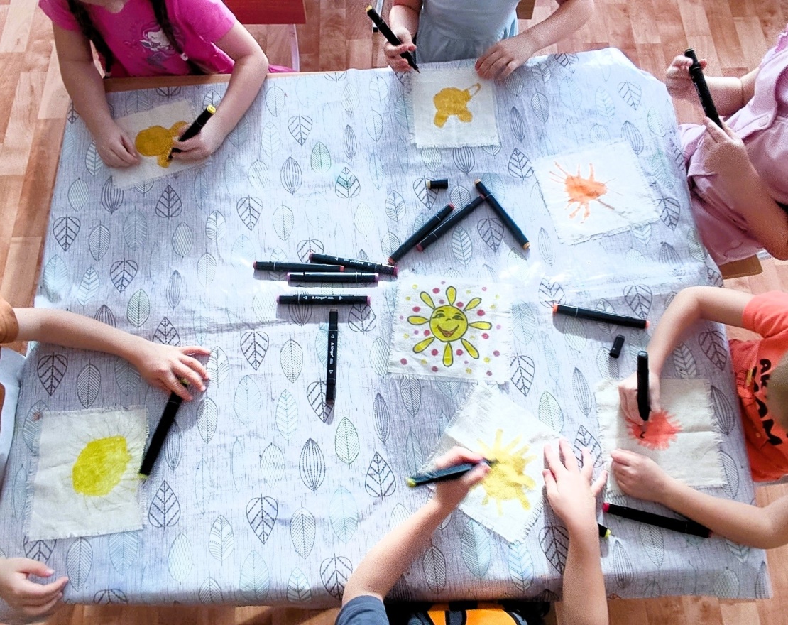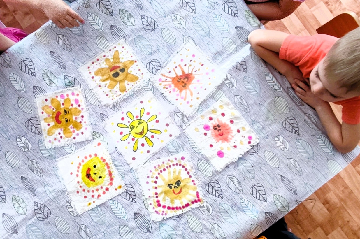 Сегодня я вам предлагаю нарисовать солнце на хлопковой салфетке специальными несмываемыми фломастерами. Они называются акриловые. Использование этих фломастеров на ткани, позволяет в дальнейшем стирать ткань без потери рисунка.