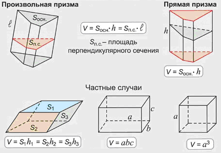 144. Назовите формулу площади полной и боковой поверхности, объема призмы, параллелепипеда, куба.