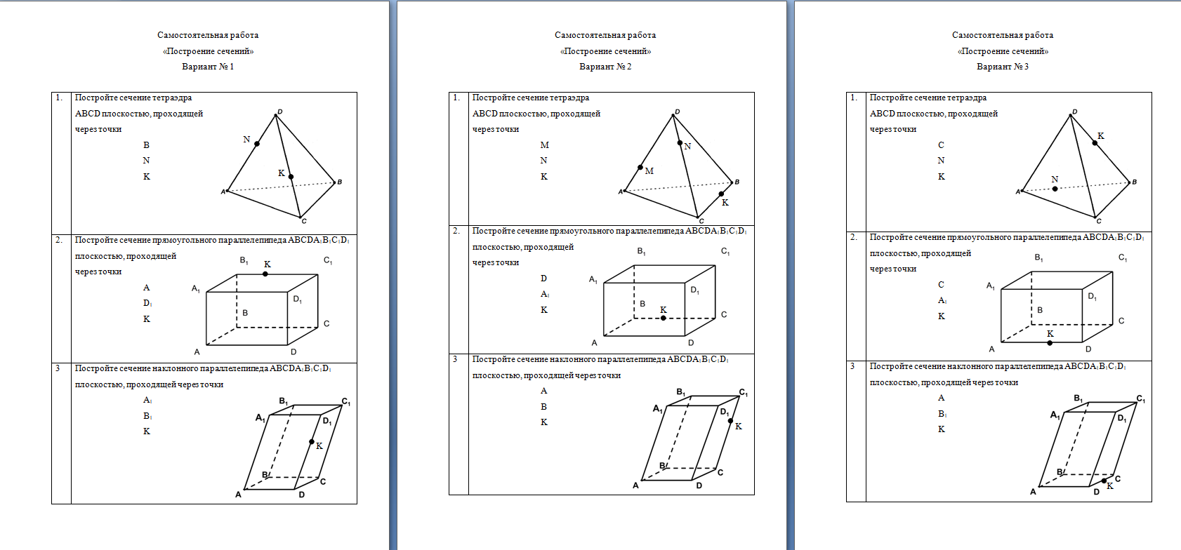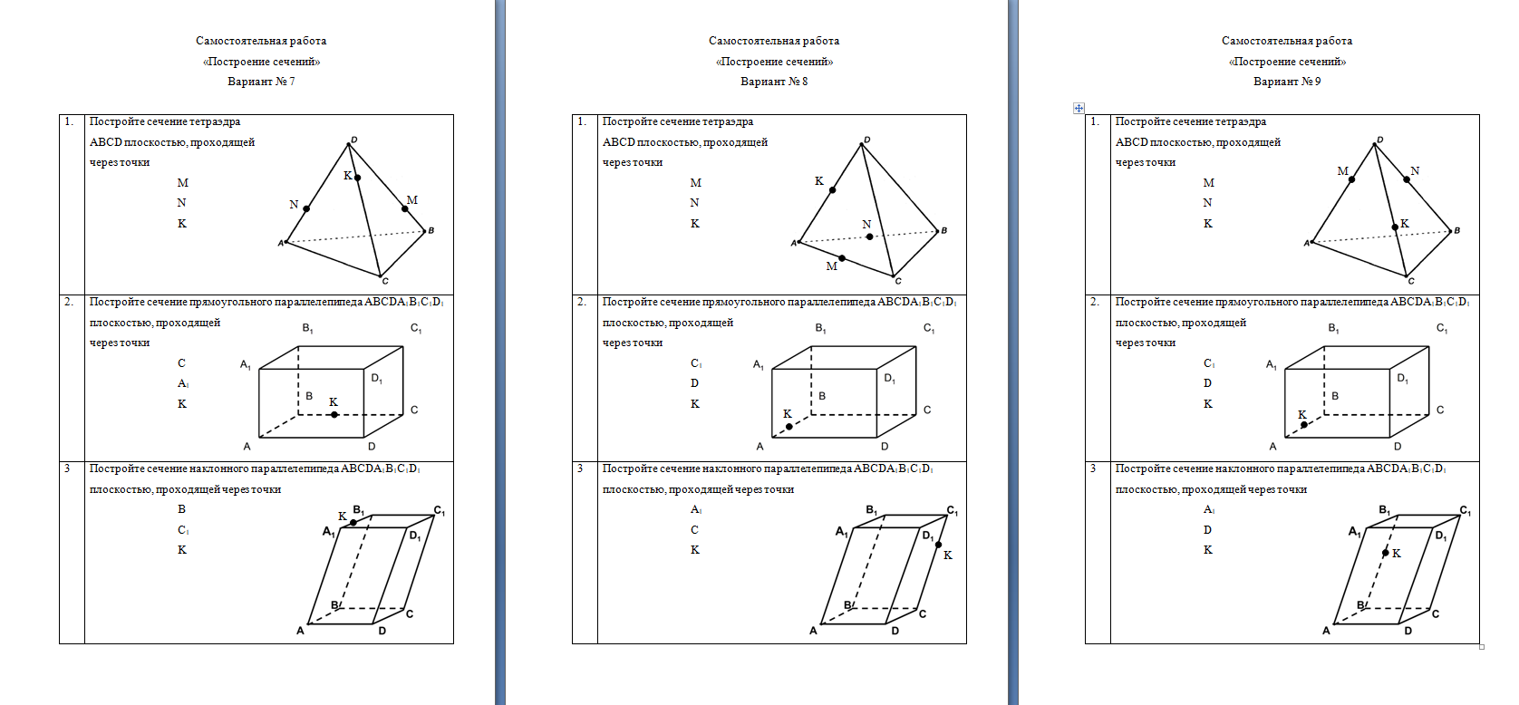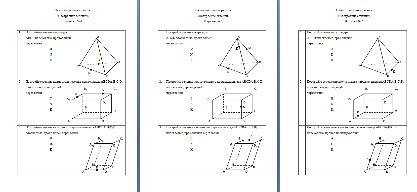 Задания к самостоятельной работе опубликованы на сайте … и доступны по ссылке:https://infourok.ru/zadanie-samostoyatelnoj-raboty-sechenie-mnogogrannikov-7579102.html
