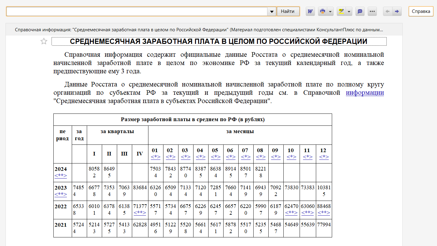 В разделе Справочная информация, в группе Трудовые отношения, социальная сфера найдите и откройте документ «Среднемесячная заработная плата в целом по Российской Федерации»: