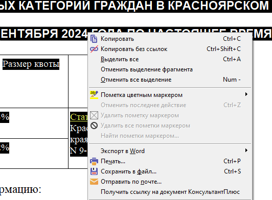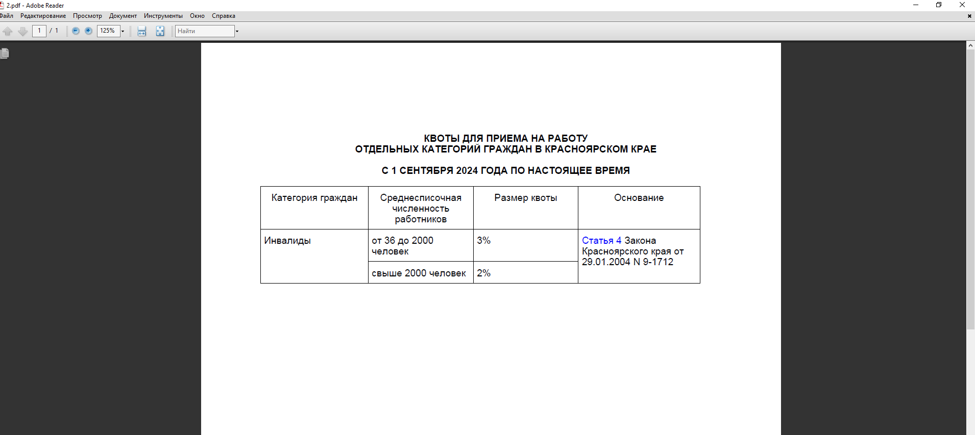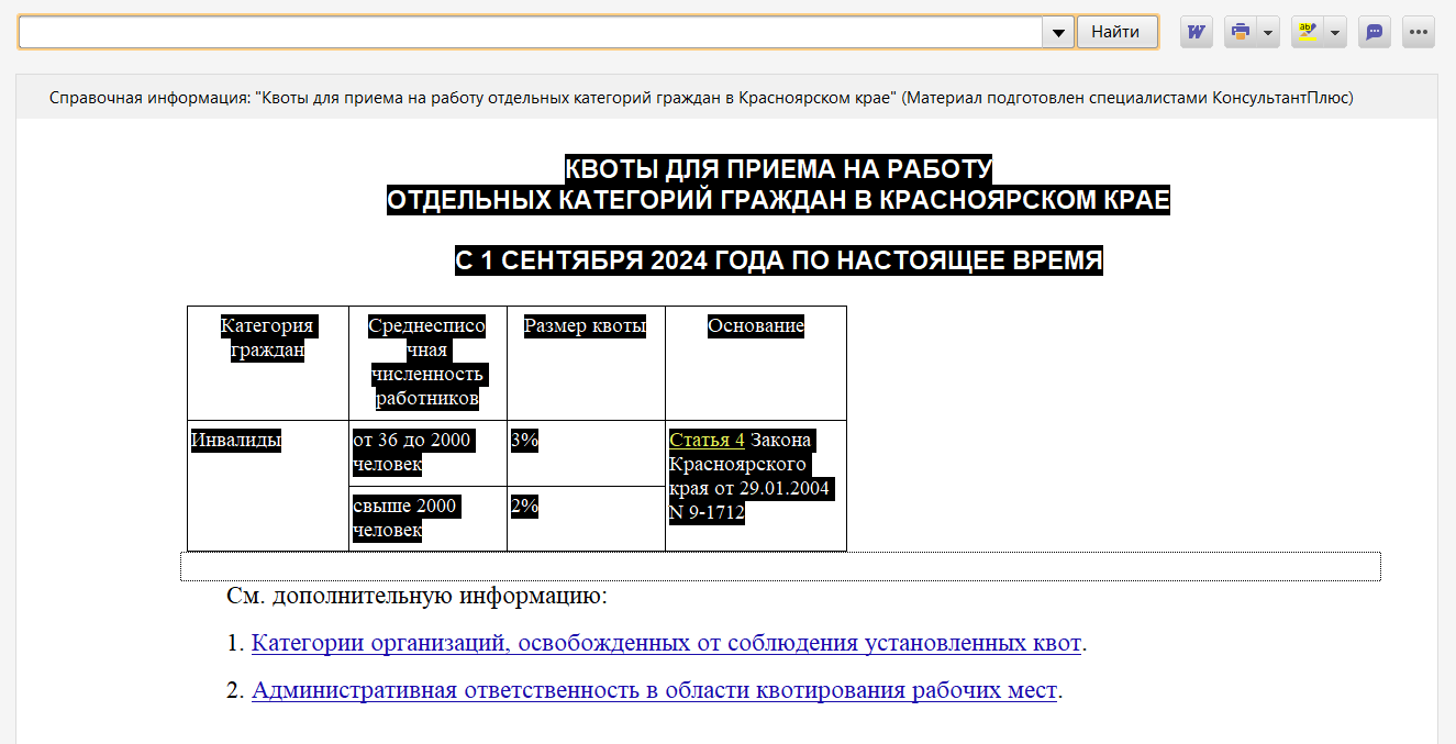 В разделе Справочная информация откройте документ Квоты для приема на работу отдельных категорий граждан в Красноярском крае. Выделите толькозаголовок документа и таблицу: