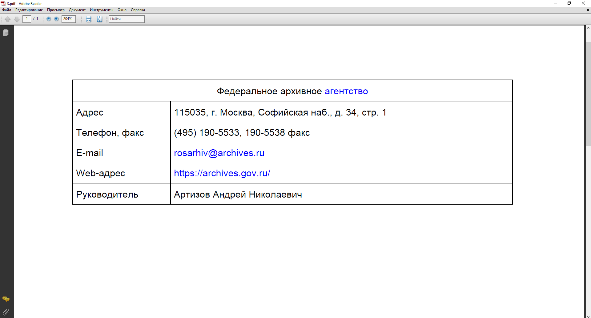 В разделе Справочная информация найдите и произведите экспорт в PDF адресно-реквизитную информацию Федерального архивного агентства. В результате PDF файл должен содержать только фрагмент таблицы с необходимым адресом:
