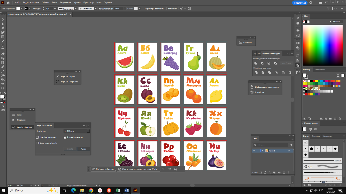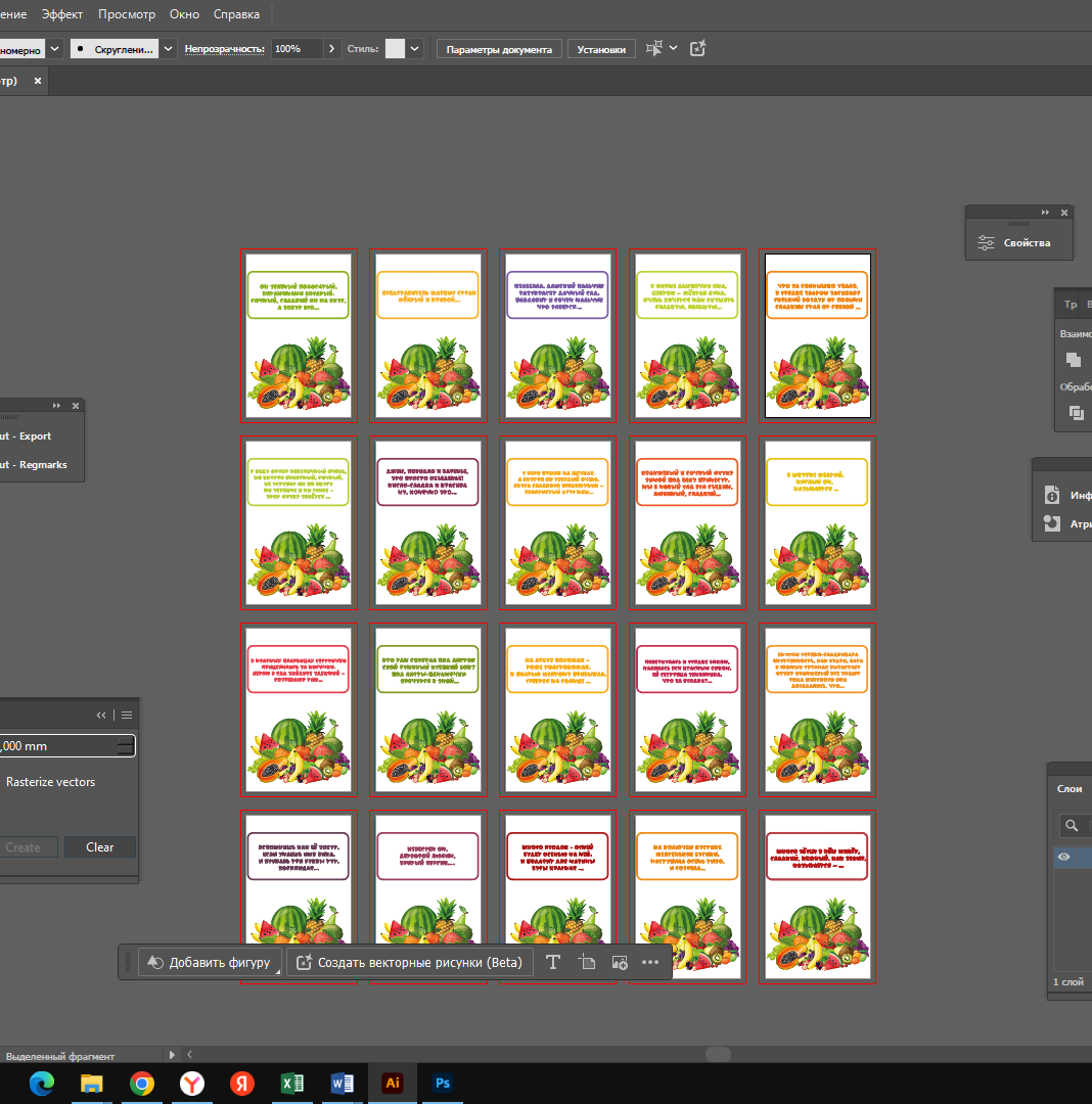 Создайте 20 монтажных областей в одном документе, это будет лицевая сторона карт. Потом создайте еще один документ, также с 20-ю монтажными областями — для оборота. Как вариант, на лицевой стороне у нас буква – на обратной стороне какое-то животное или предмет на эту букву.