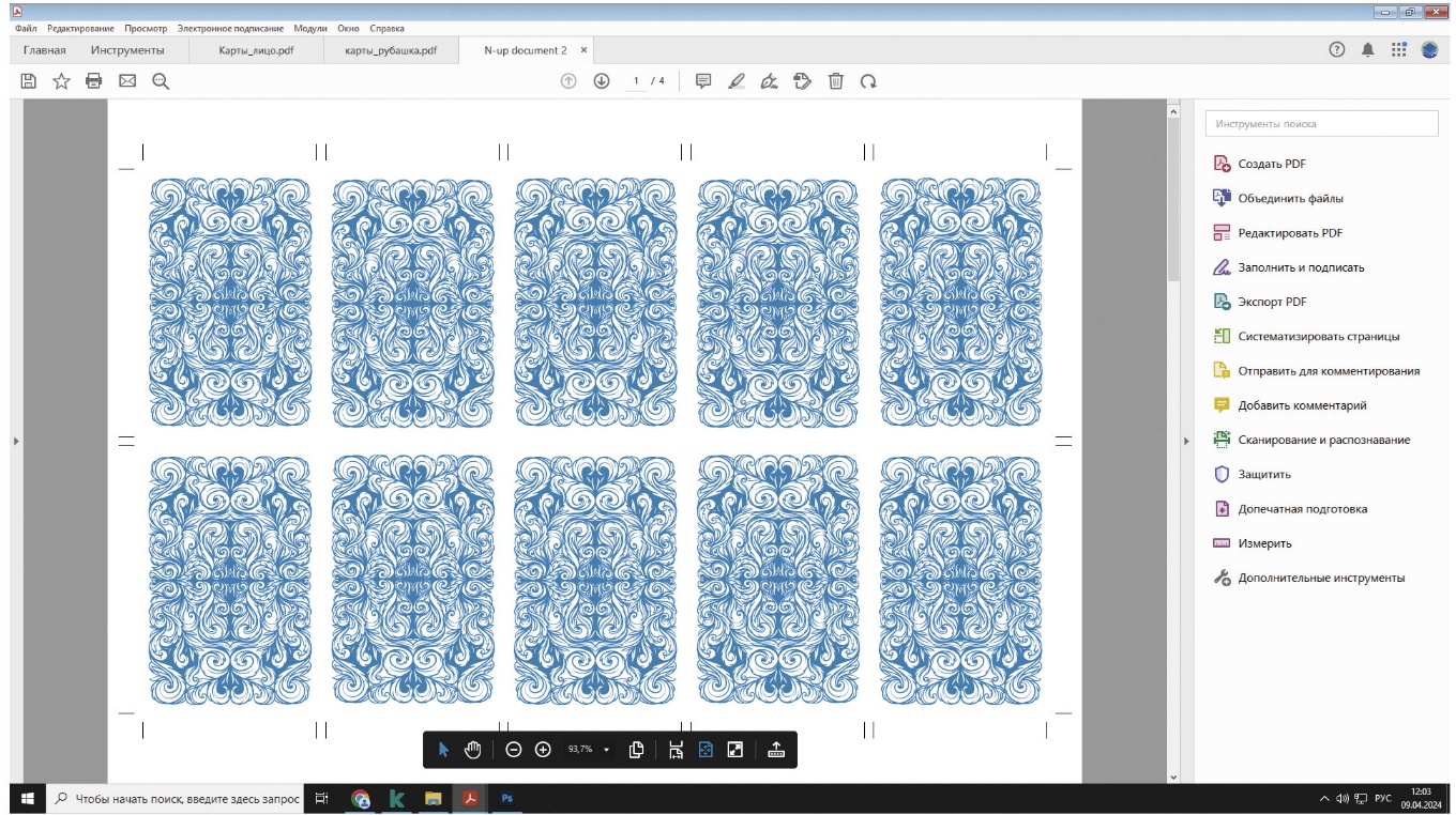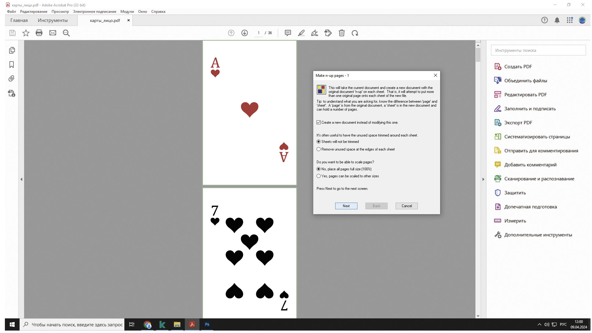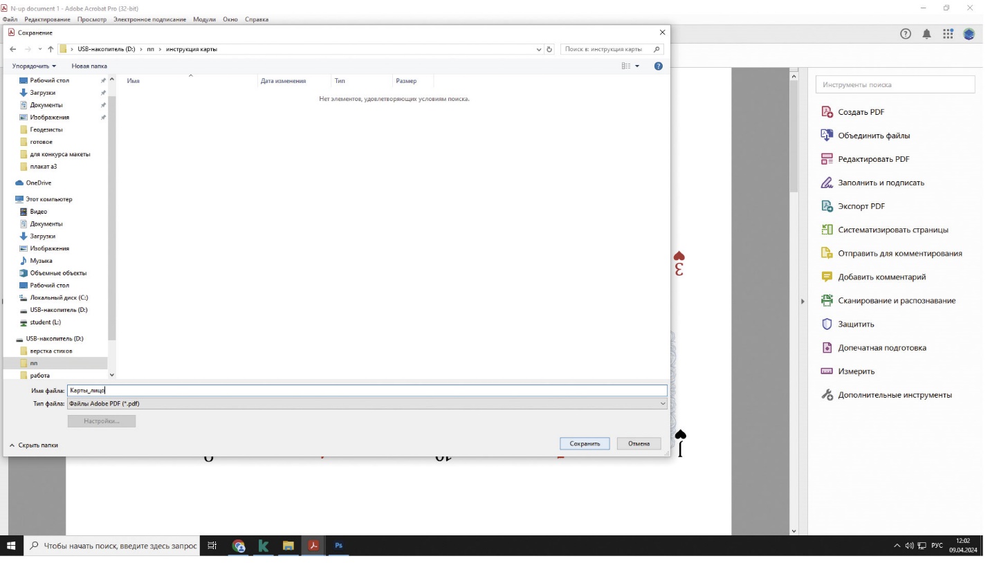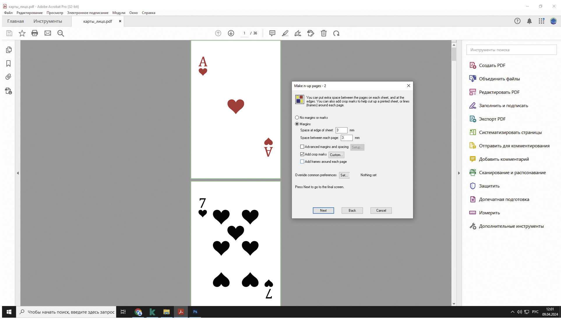 Сохраните отдельно лицо и оборот в формате pdf, стиль pdf-x-1