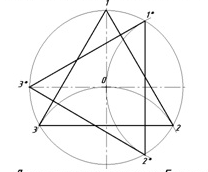 Для выполнения данного задания нужно раствором циркуля радиуса окружности, сделать засечки на самой окружности. При этом иглу циркуля поставить в нижнюю точку пересечения окружности с осевой линией. Полученные точки в результате выполнения засечек соединить с вершиной, как показано на примере. Расположение (наклон) вписанного треугольника можно изменить, меняя точку из которой выполняются засечки (точки пересечения осевой линии с окружностью).