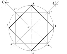 Поделить окружности на 12 равных частей. Из четырех точек пересечения окружности с линиями оси сделать засечки в каждую из сторон раствором циркуля радиус окружности. Соединить последовательно все точки.