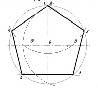 Задание 5. Для деления окружности на 5 равных частей нужно одну из половин горизонтальной осевой линии поделить пополам при помощи линейки, из полученной точки провести дугу через нижнее и верхнее пересечение оси с окружностью. В том месте где дуга пересеклась с горизонтальной осевой линией, ставим точку и этим радиусом делаем засечки на самой окружности. Пронумеровав их по порядку вписывает пятиугольник.