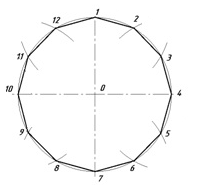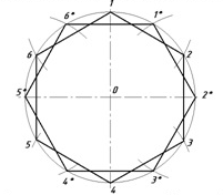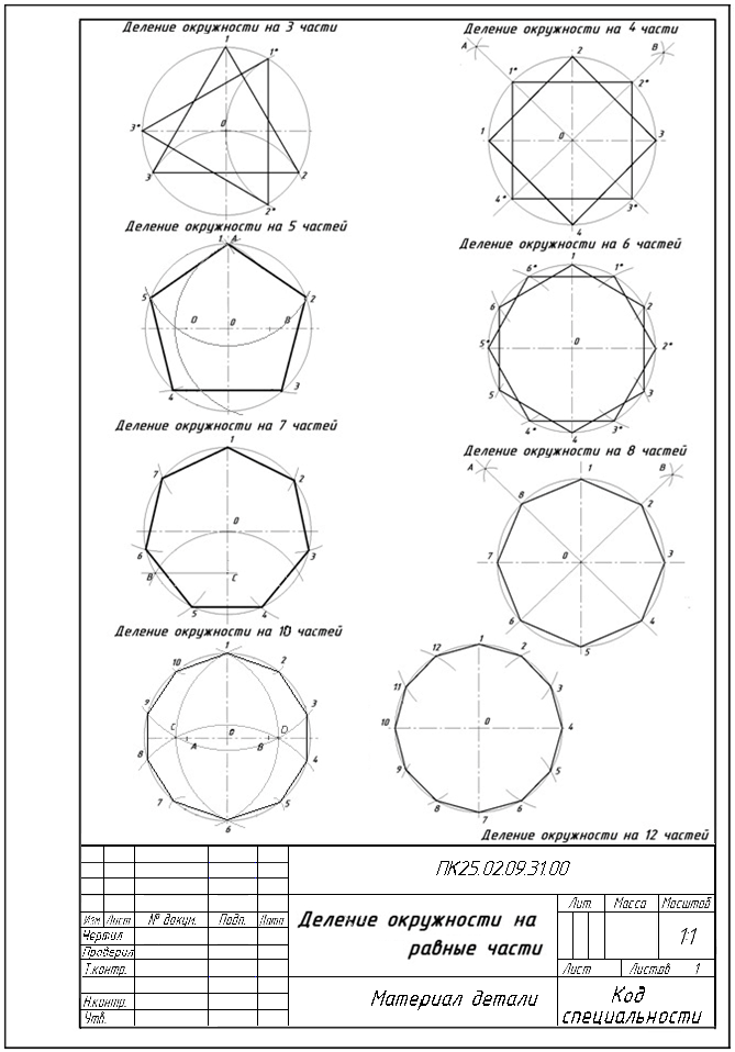 При делении окружностей на равные части вспомогательные линии и элементы необходимо выполнять тонкими линиями с помощью твердого карандаша (Т или 2Т).