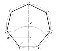 Необходимо из нижней точки пересечения окружности с осевой линией провести дугу таким же радиусом как у окружности. В месте пересечения дуги с окружностью получаем точку, от которой нужно провести перпендикуляр к вертикальной осевой линии. Измеренным перпендикуляром сделать засечки и вписать семиугольник.