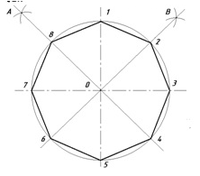 Задание 8. Чтоб поделить окружность на 8 частей. Нужно воспользоваться двумя способами деления окружности на 4 части. Таким образом соединив последовательно все точки, получится вписанный в круг восьмигранник.