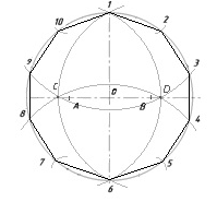 Задание 9. Для деления окружности на 10 равных частей пользуемся способом деления на 5 равных частей, выполняя построения с обеих сторон.