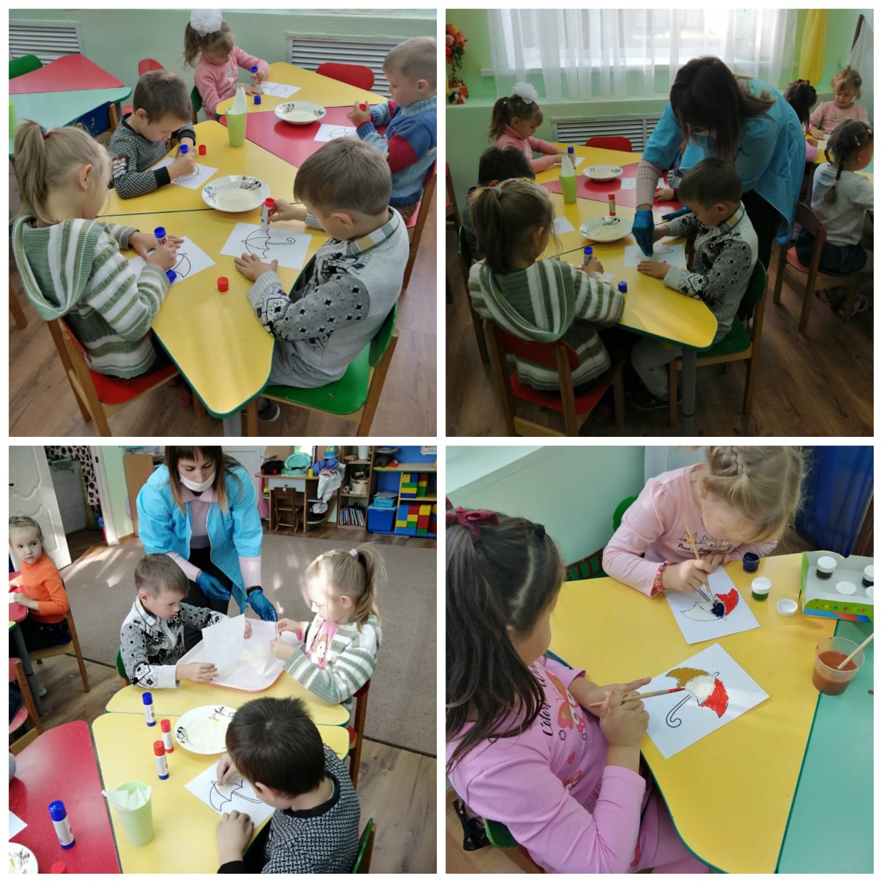 Материал:½ листа А4 с заранее нарисованным зонтом, клей – карандаш, манка, поднос, кисти, гуашь (любых цветов), стакан-непроливайка, салфетки.