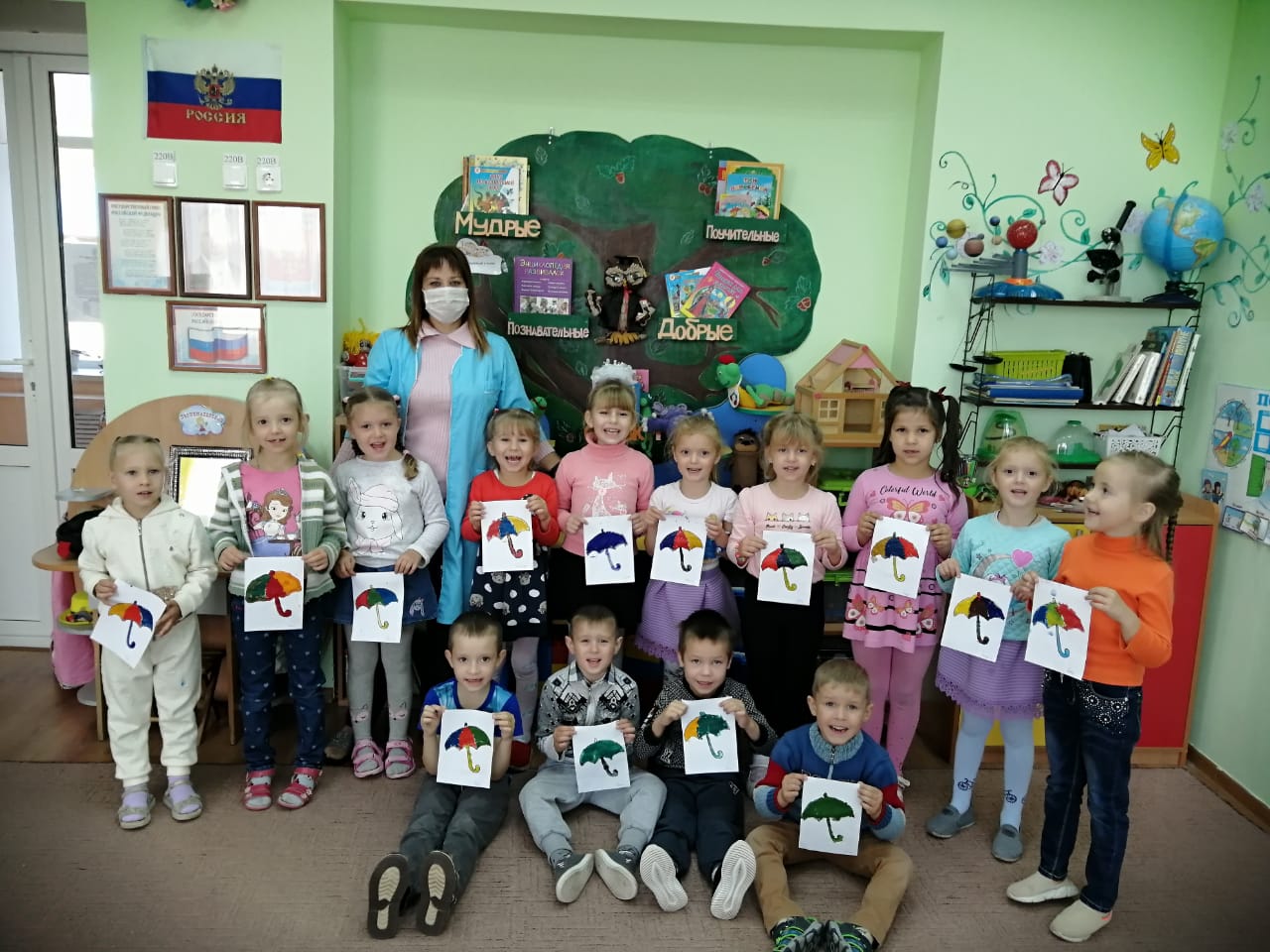 Кукла: Молодцы! У вас есть зонтики?
