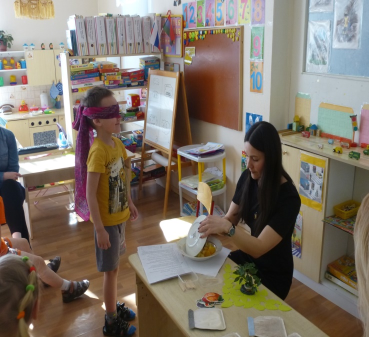 Детям и родителям завязываются глаза и они по очереди подходят к ведущему и пробуют содержимое тарелочки. Попробовав – называют – что они съели.
