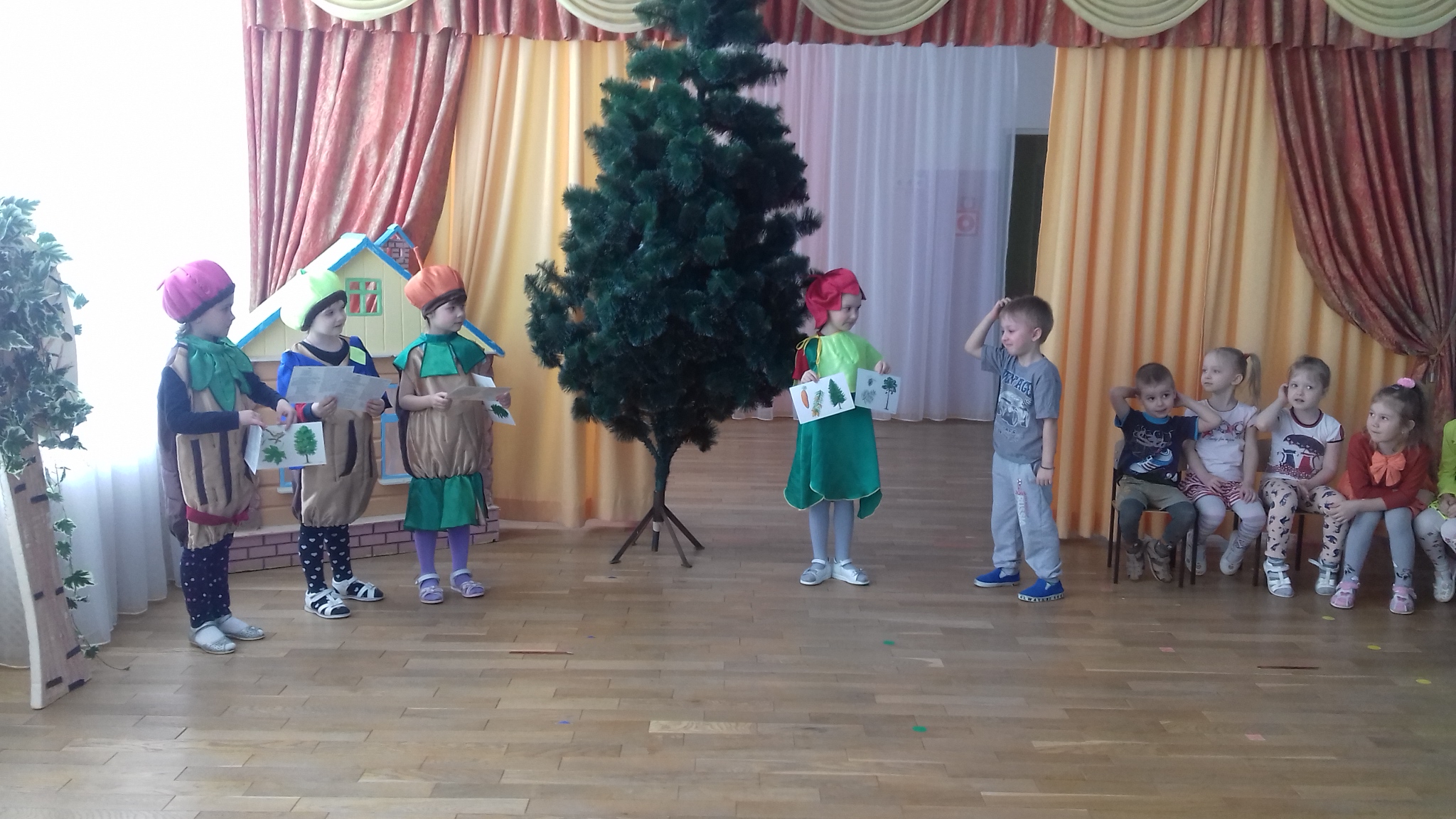 Елочка:Hello! Привет! My name is Ёлочка.МенязовутЕлочка. Boys and girls, help us. Мальчики и девочки, помогите нам! Name the trees around. Подскажите мне названия деревьев.