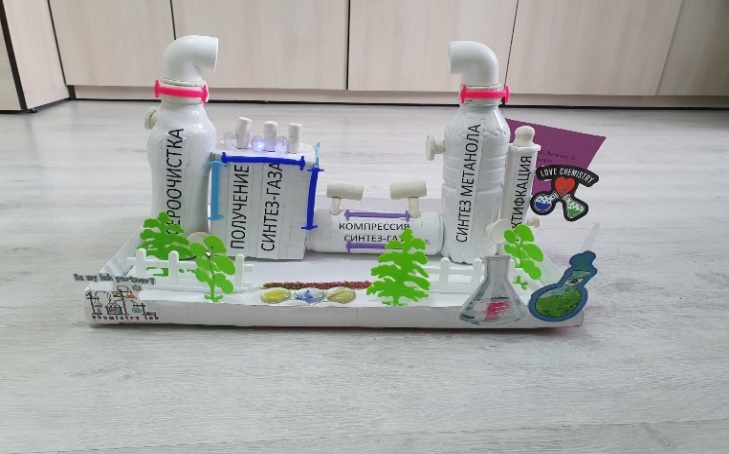 4. Участие в научных конференциях, посвященных вопросам практической направленности, связанные с профессиями, требующими знания по химии, экологии, биологии, химическими технологиями и техникой безопасности при работе с различными веществами. Мы решили произвести уменьшенную модель (макет) завода по производству метанола с целью визуализации малотоннажного производства метанола в форме мини-завода, а также макет 3д по сбору и утилизации батареек(Приложение 2). Видео представлено на Яндекс диске: https://disk.yandex.ru/d/k8JjiQxKBdh0ow