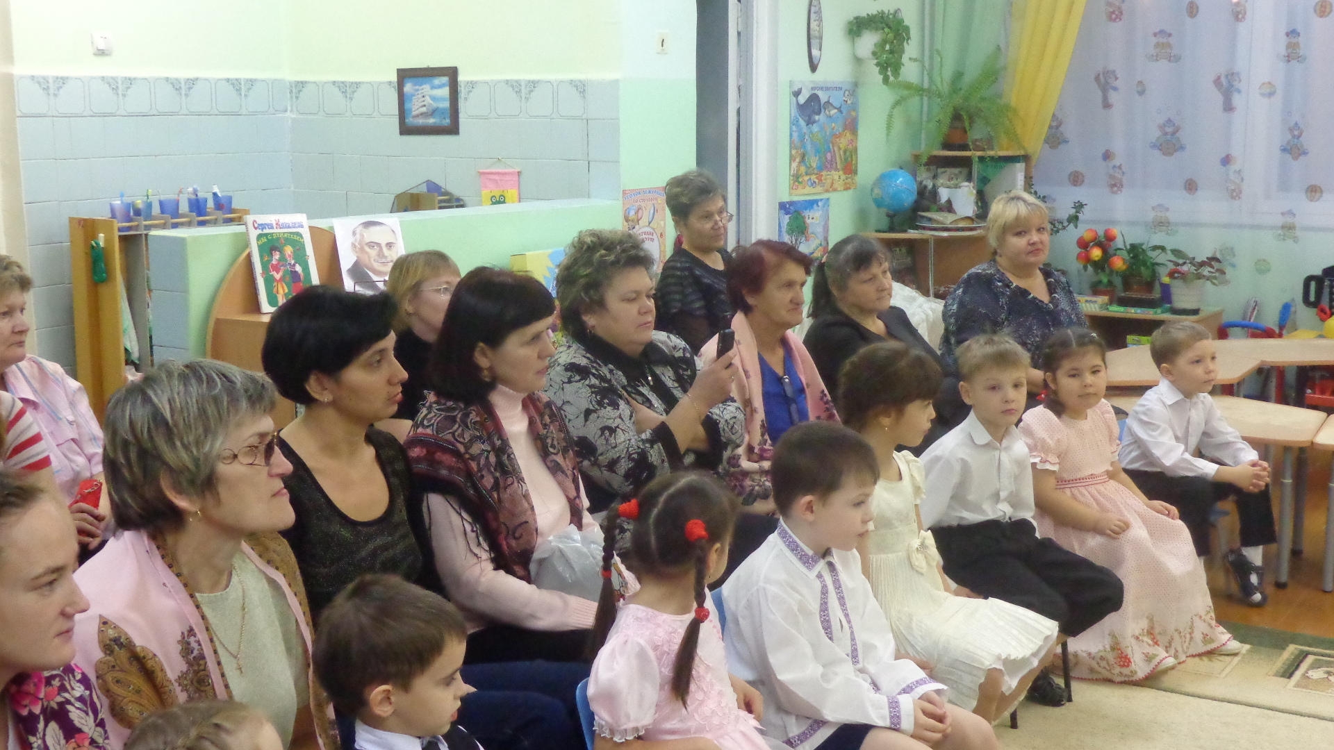 Дети вместе с членами семьи сидят полукругом. Воспитатель в центре, перед гостями.