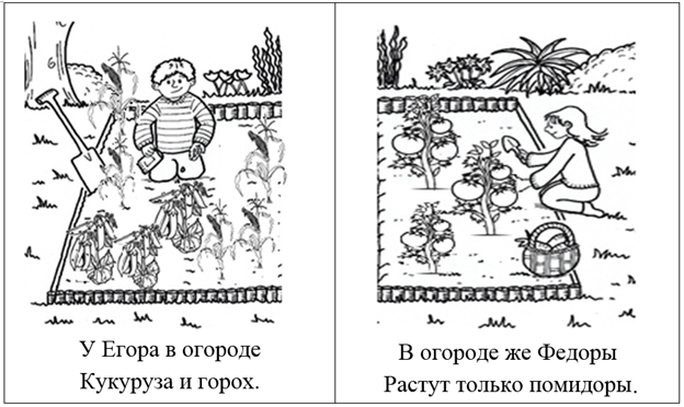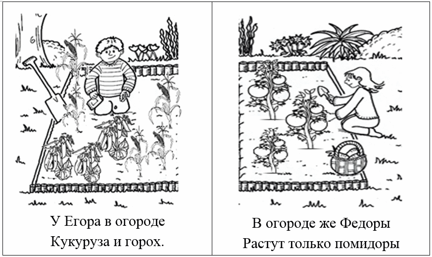 III.2. Домашнее задание | Объяснение домашнего задания | - Посмотри, перед тобой изображение огорода Егора и Федоры (Приложение 5). У Егора в огороде Кукуруза и горох. В огороде у Федоры Растут только помидоры. - Раскрась овощи. Выучи предложения, четко проговаривая звук [Р].