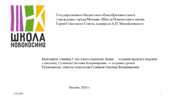 Выполнила: ученица 5 «Ц» класса Данилова Лидия — создание продукта (корзина с цветами), Сулицкая Светлана Владимировна — создание уроков